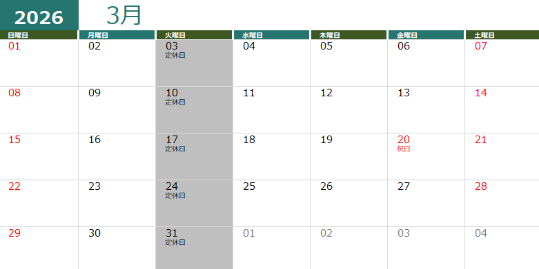 2026年3月の営業時間は以下の通りになりますので、宜しくお願いいたします。 定休日: 3日、10日、17日、24日、31日(毎週火曜日)平日 : 11:00~21:00(最終受付20:30)土日祝: …